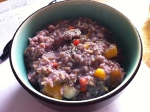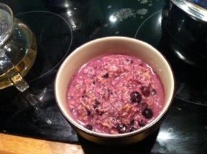 Breakfast, VeganWhole organic oat groats (AKA pinhead oats, Scottish oatmeal, Irish oats, steel-cut oats), hulled hemp seeds, ground whole hemp seeds, flax seeds, coconut flakes, coconut meal, crushed cardamom seeds, raw cacao nibs, frozen bananas, frozen blackcurrant berries, a bit of psyllium.
