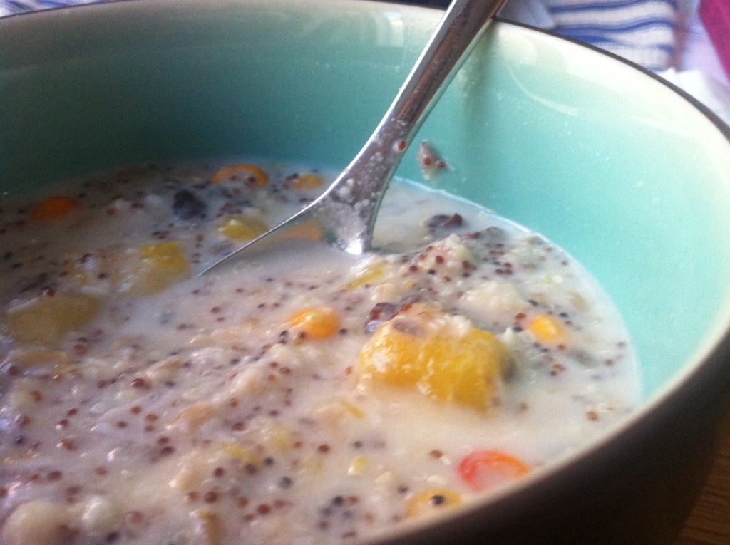 Every morning I make a different porridge, but it gets boring to document them… This one was a bit unusual: mango, sea buckthorn berry coconut shredded and flour, canihua, oats, flax seed, hulled hemp seeds.